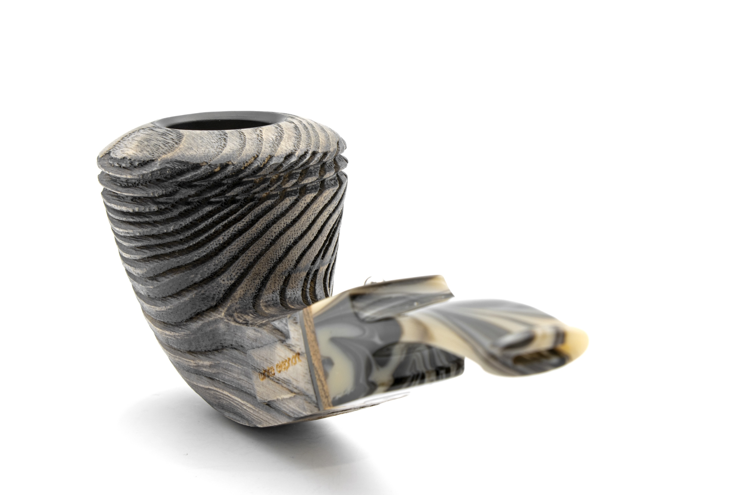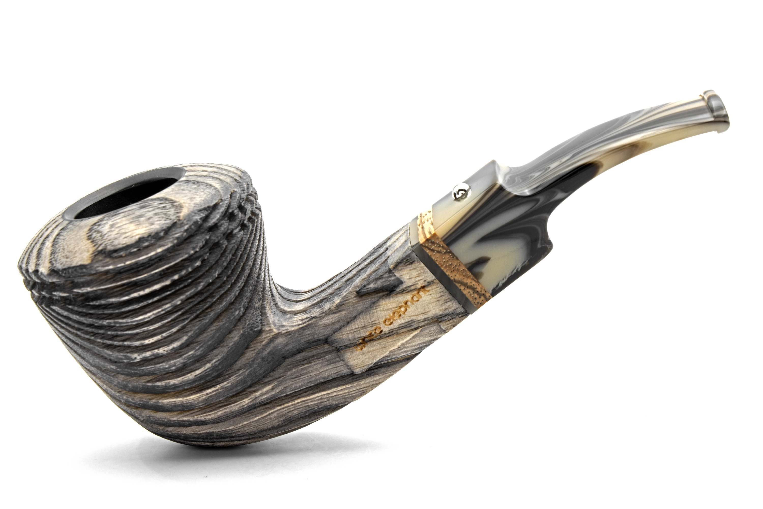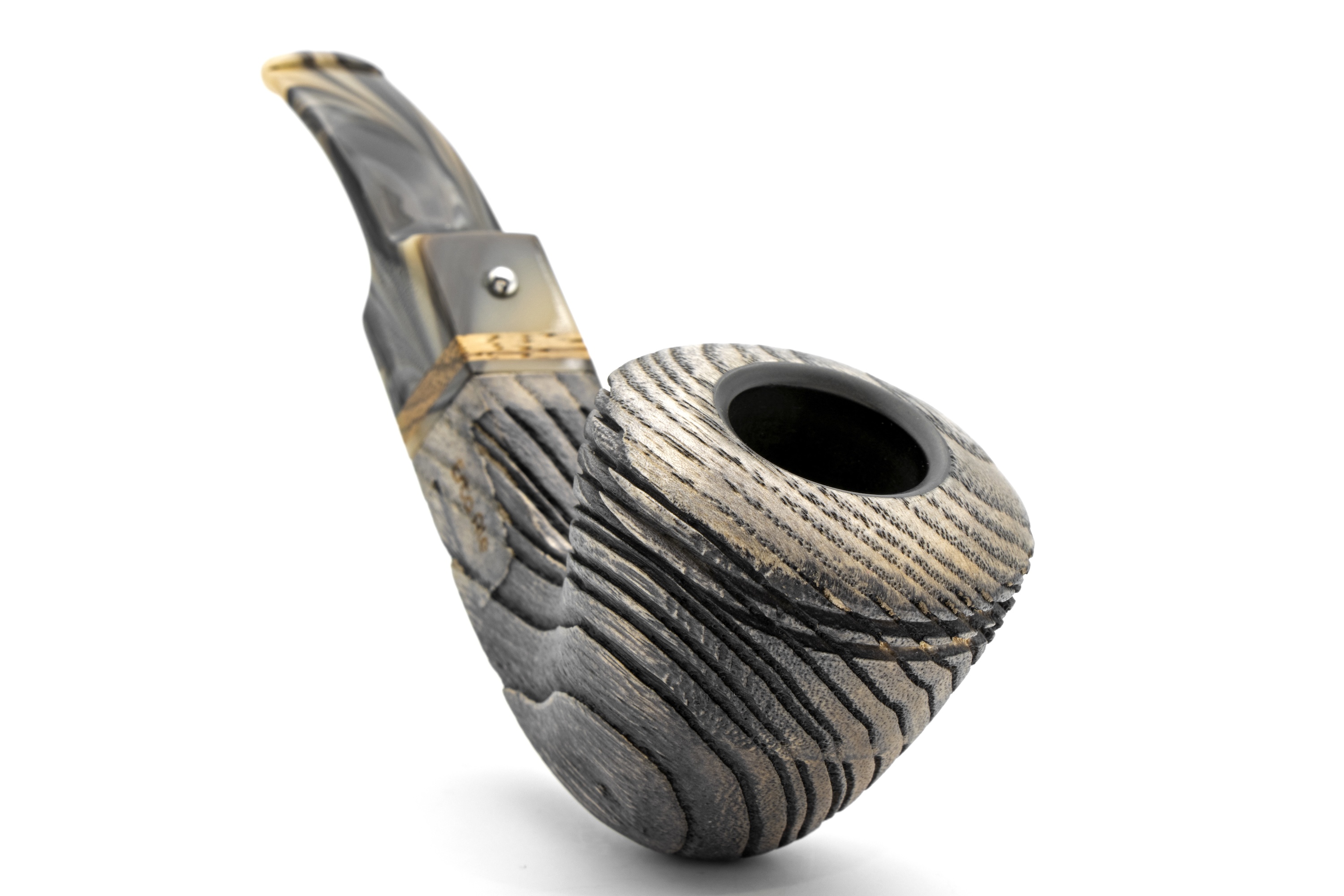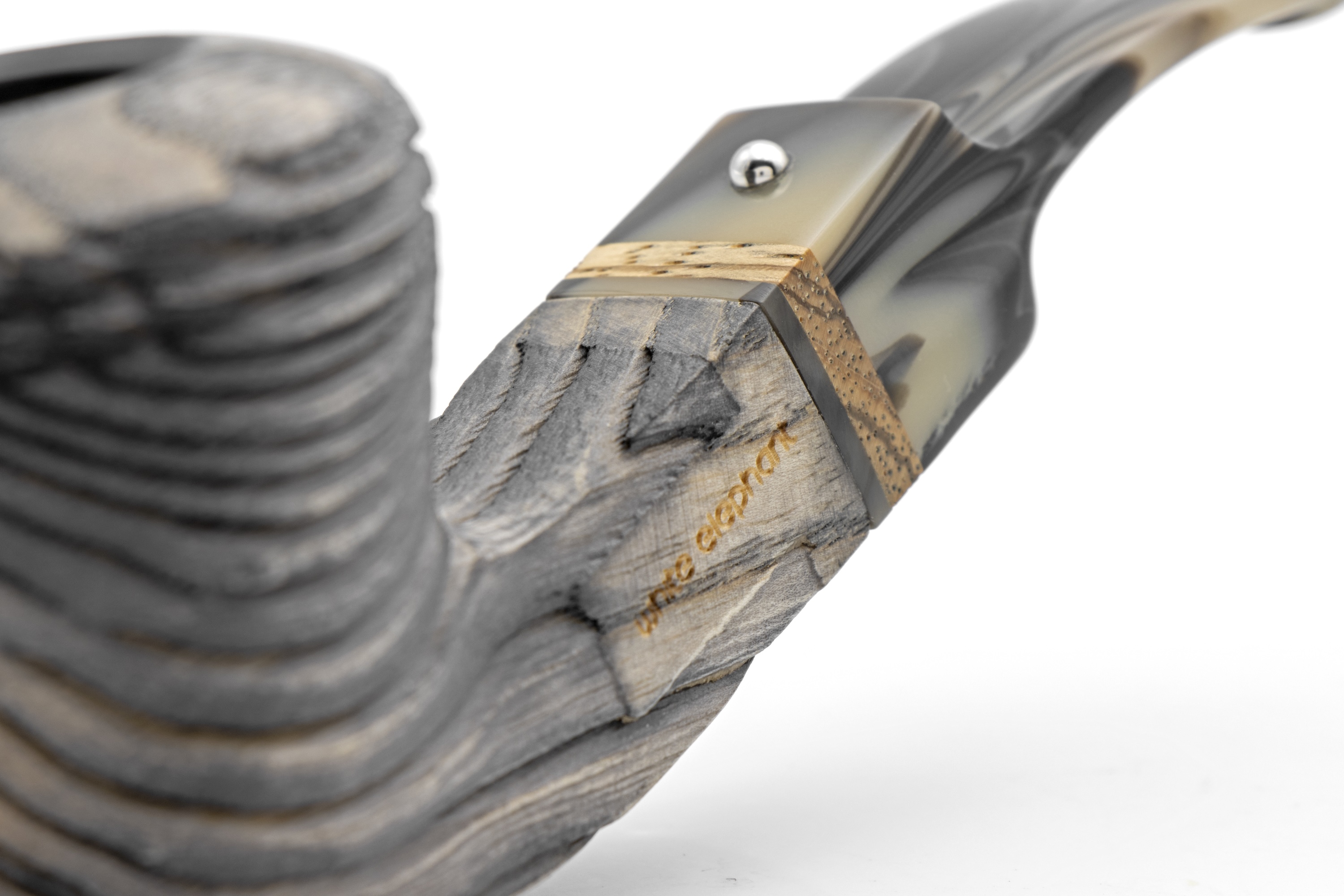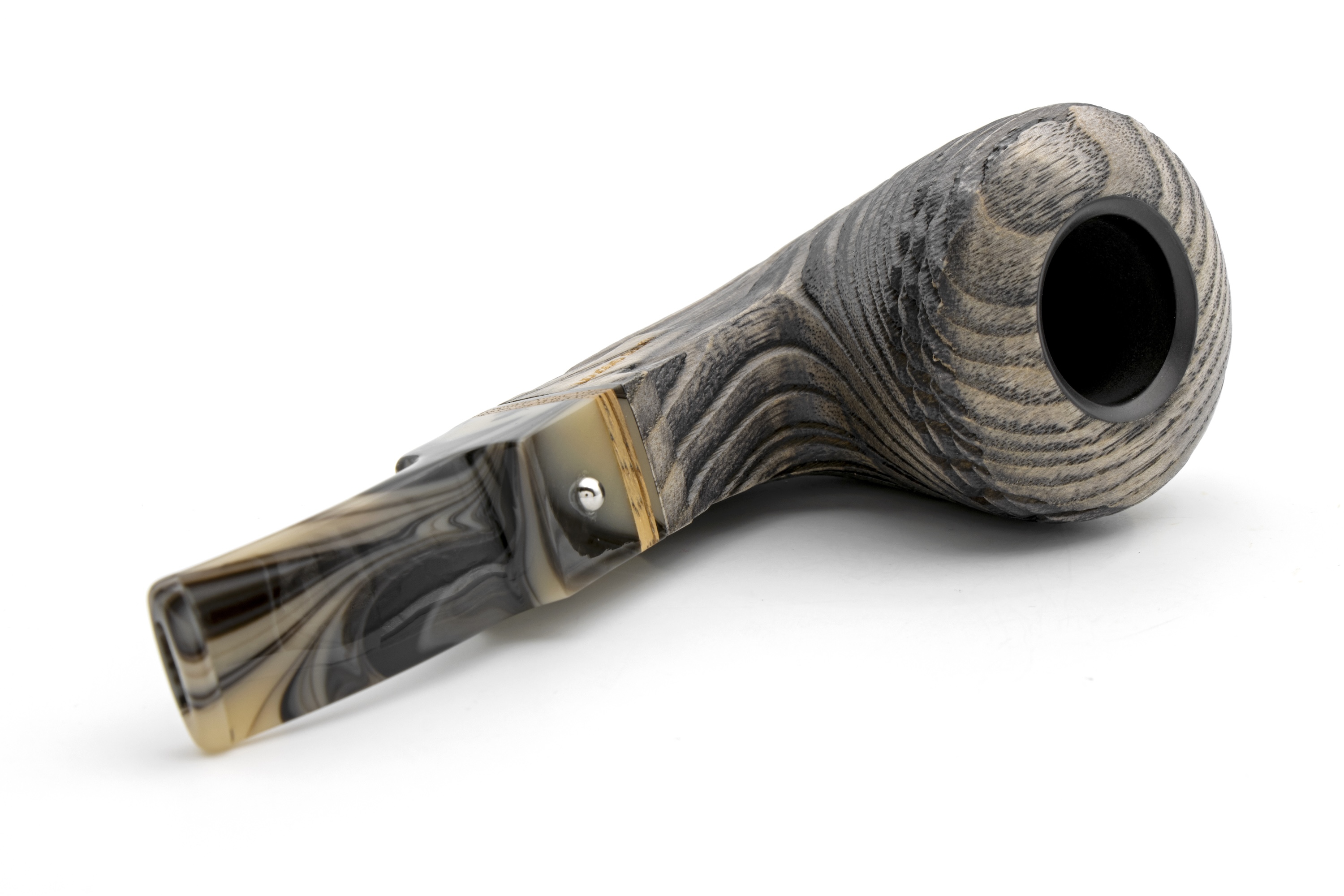 Kommen wir nun zum Wesentlichen. Die Erta Ale Modelle sind groß und dennoch kompakt. Der Kopf besteht aus südamerikanischer Esche, die nach einer intensiven Sandstrahlung eine tiefe und beeindruckende Struktur liefert. Wir haben das Holz diesmal aschgrau beizen lassen. Das Mundstück haben wir hierauf abgestimmt. Die heiße Acrylmasse wird hierbei nur leicht verrührt. Darin eingelassen haben wir einen echten Zebranoring, der die wilde Naturoptik unterstreicht.