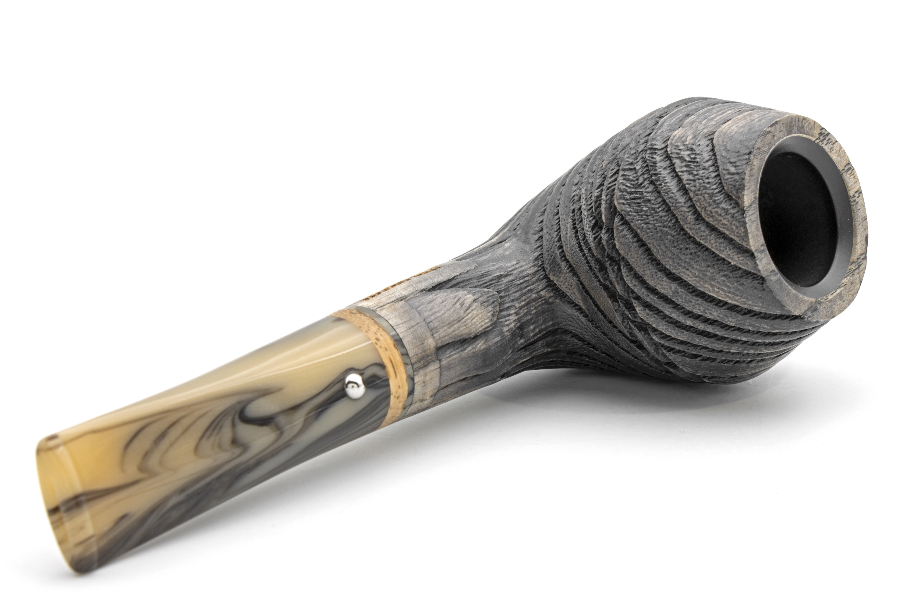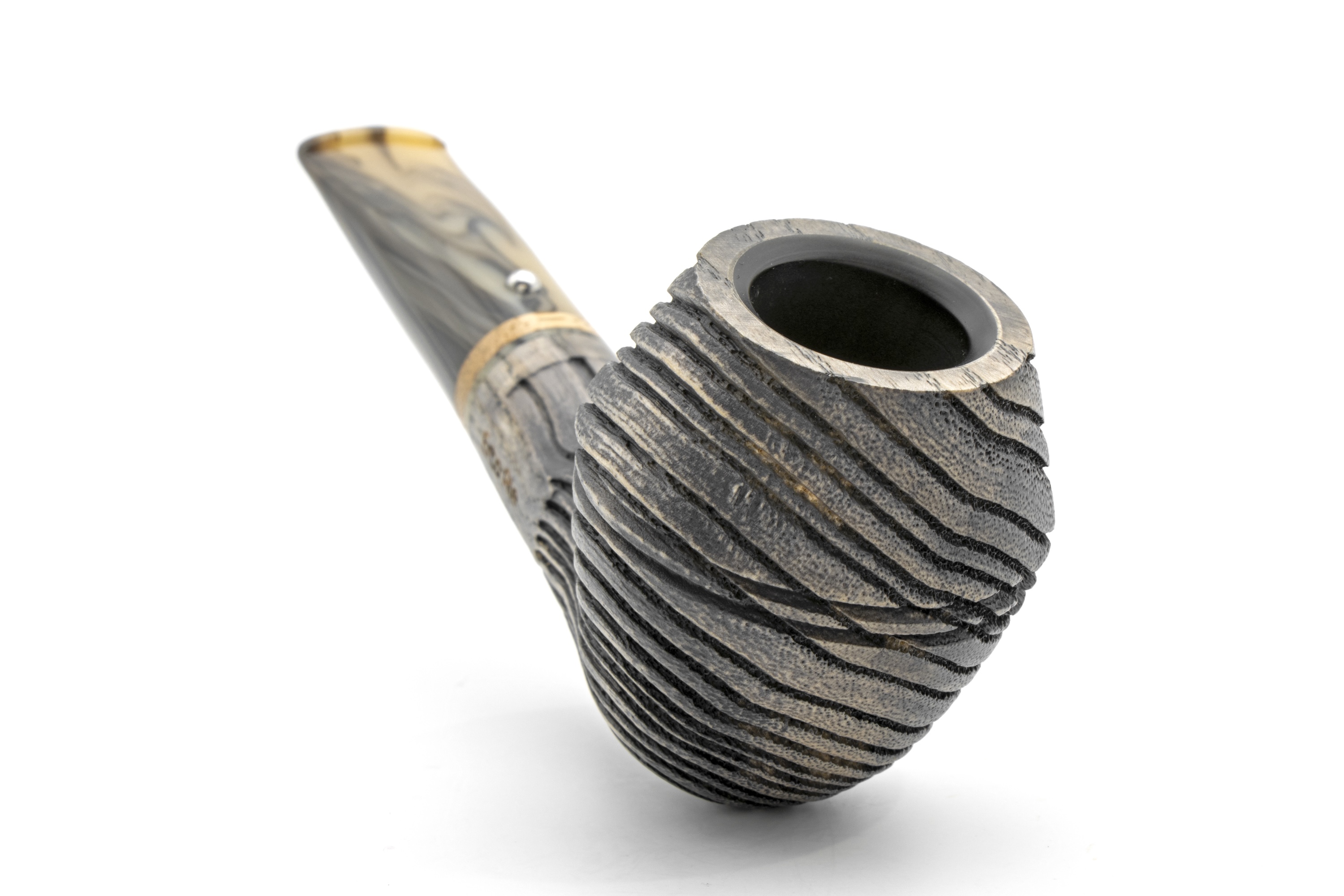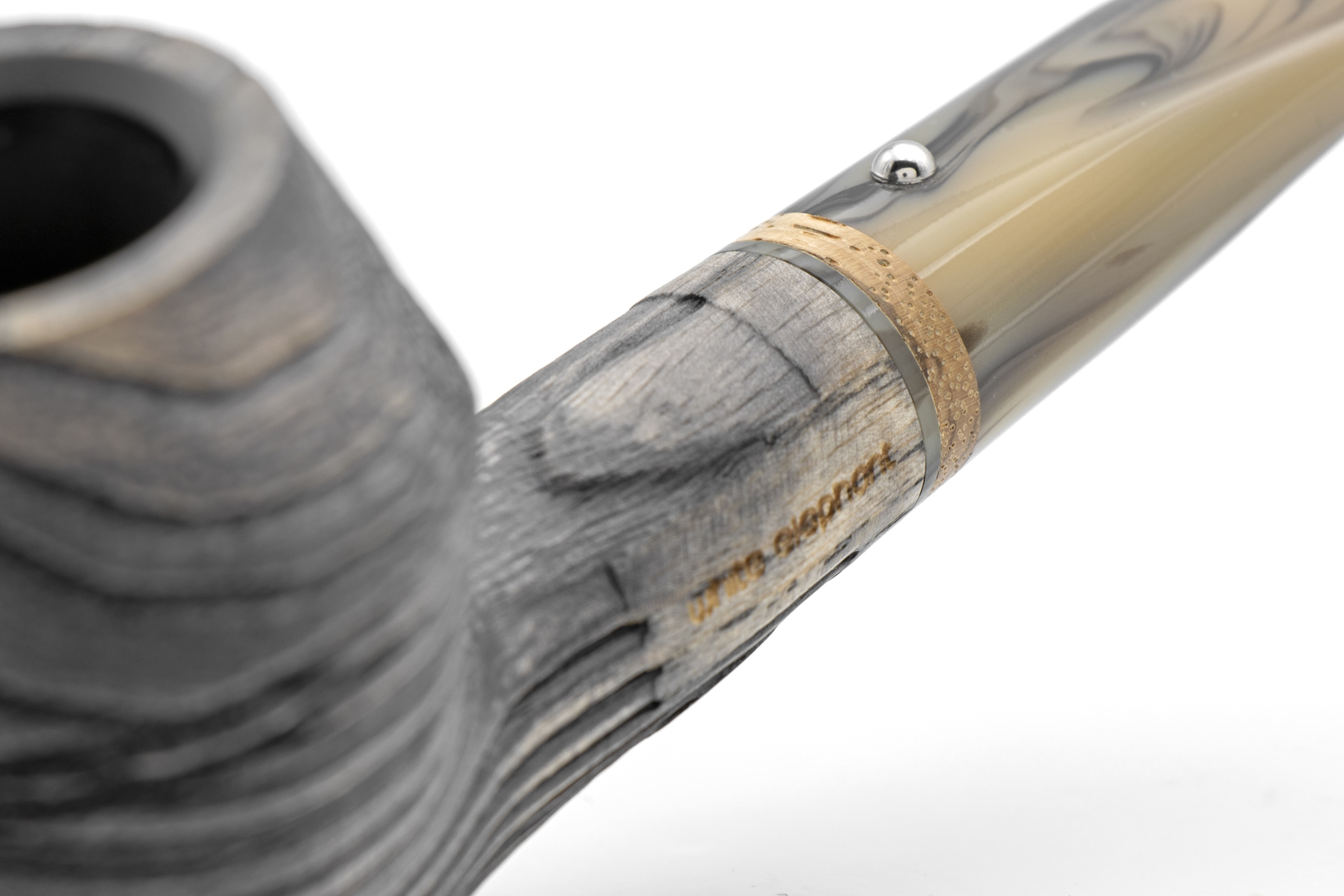 Now let us come to the essentials. The Erta Ale models are large yet compact. The bowl is made of South American ash, which, after intensive sandblasting, delivers a deep and impressive structure. This time, we have stained the wood ash grey. The mouthpiece has been coordinated accordingly. The hot acrylic compound is only lightly stirred during this process. Set into it, we have incorporated a genuine zebra ring, which emphasizes the wild natural look.